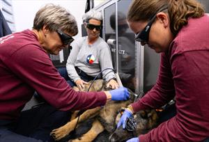 Dr. Debra Zoran (left) and colleagues used a medical laser to treat muscle soreness and injury in search and rescue dogs that assisted during floods this year along the Guadalupe River in central Texas.